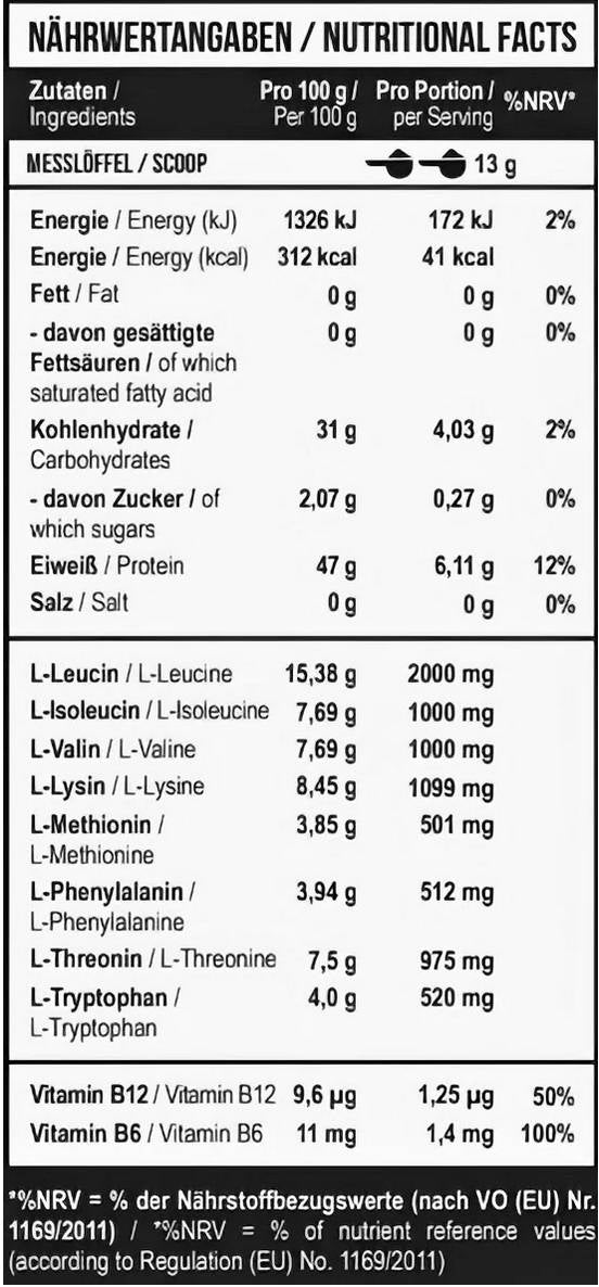 Maltodextrin, L-Leucin, L-Lysin, L-Isoleucin, L-Valin, L-Threonin, Säure (Zitronensäure), L-Tryptophan, L-Phenylalanin, L-Methionin, Aromastoffe, Süßstoff (Sucralose), Pyridoxinhydrochlorid, Cyanocobalamin.