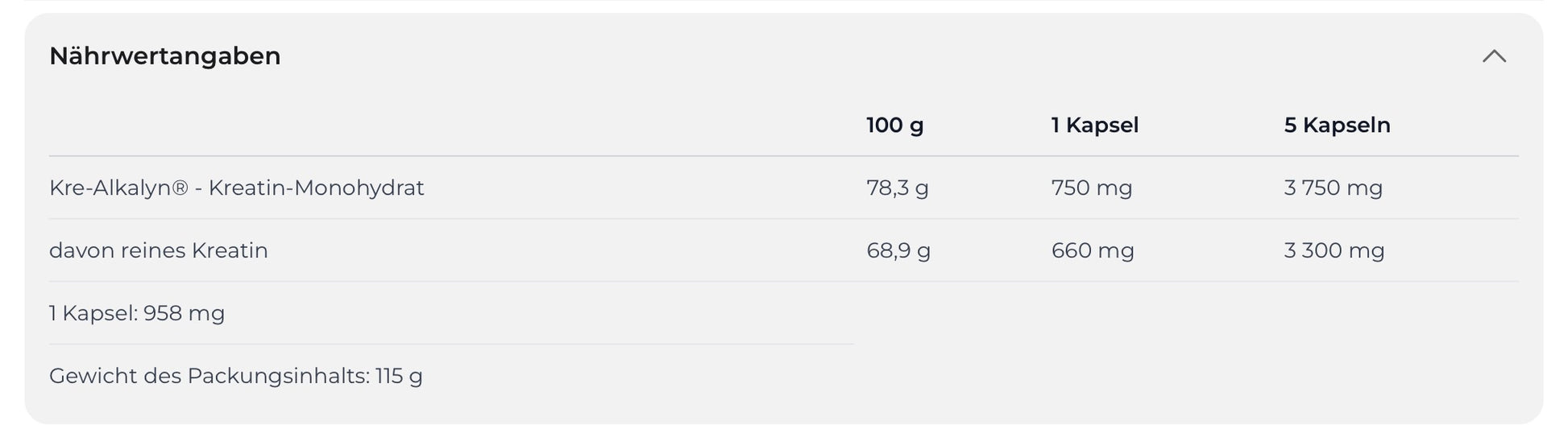| Kre-Alkalyn® - Kreatin-Monohydrat | 78,3 g | 750 mg | 3 750 mg |