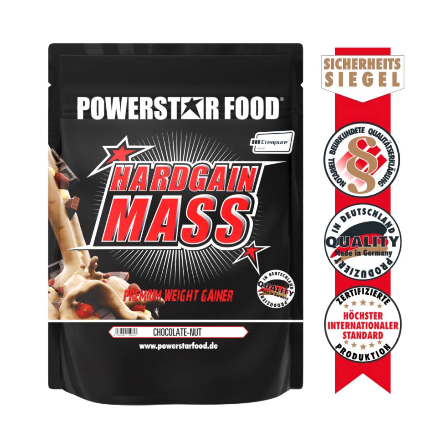 HARDGAIN MASS von POWERSTAR FOOD ist der ultimative Weight Gainer für qualitativen Masseaufbau, bestehend aus einer komplexen Kohlenhydratmatrix ohne Zucker, und ohne Süßungsmittel, einem unvergleichlich hohen Proteingehalt, einem besonderen Aminosäurenkomplex, Resorptionsbooster und dem reinsten Kreatin Monohydrat Creapure®.